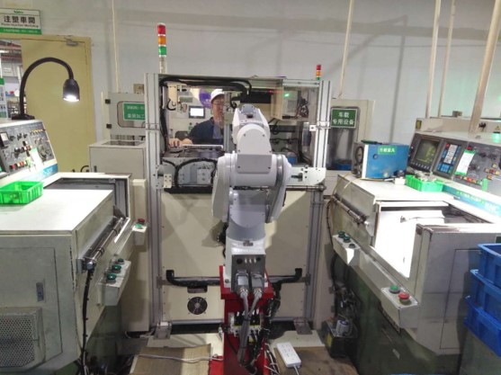 系统特点 一台六轴机械手臂控制两台KNC机床的上料下料作业 2套视觉系统,控制KNC机床轴到位状况 一次性供料160pcs,半小时做一次上下料 程序支持随时品保抽检功能及其他订制化需求 配置多项传感器,安全锁,系统安全可靠 |